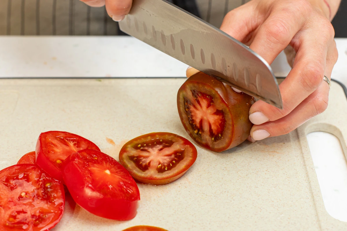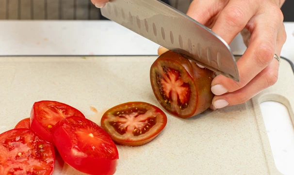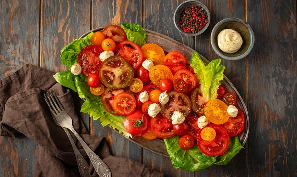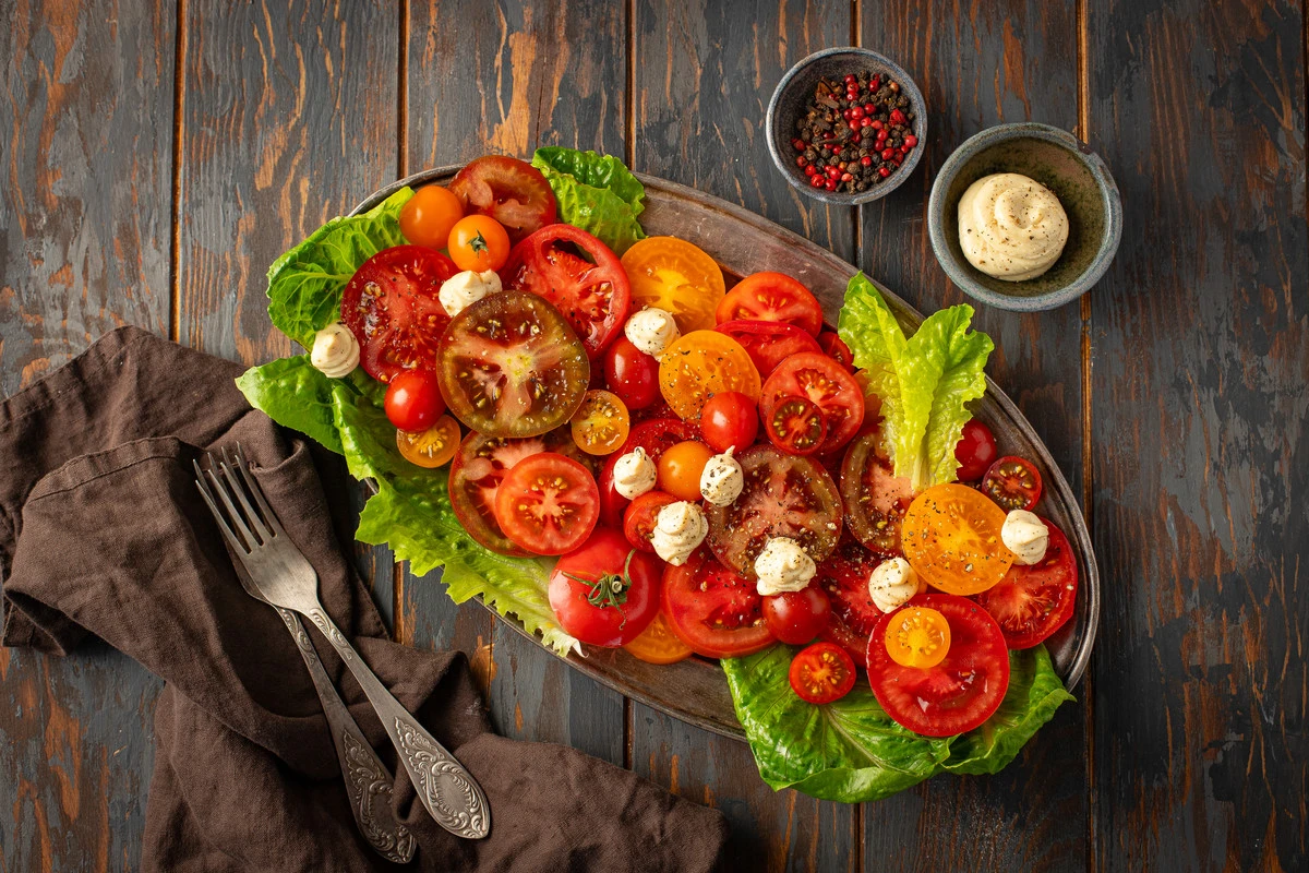 Сочные, сладкие томаты в самый сезон вкусны и так, но особую пикантность им придаст домашний соус «Цезарь». Большое блюдо с помидорами разных цветов и размеров с листьями салата и соусом отлично дополнит как повседневный летний обед или ужин, так и праздничный стол.