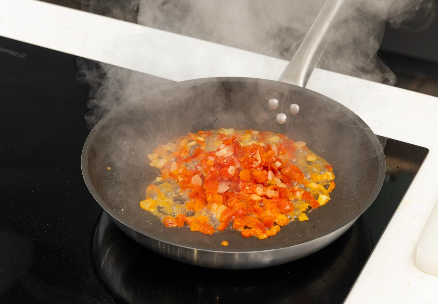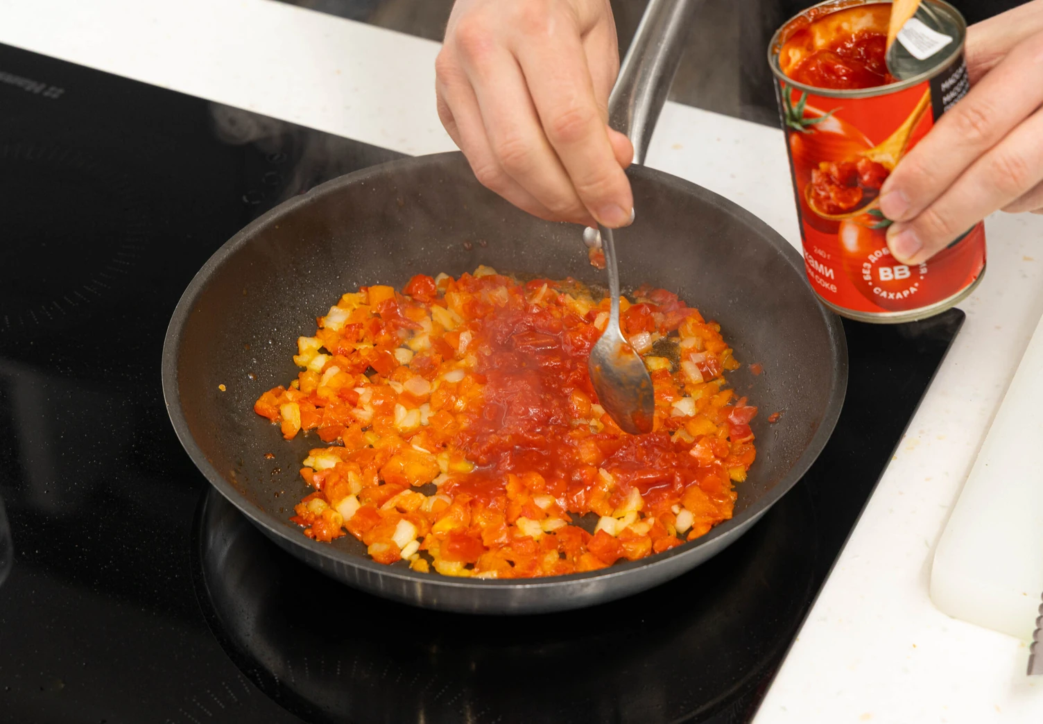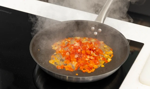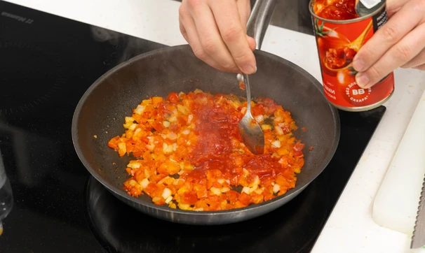 Добавьте в сковороду томаты вместе с соком, перемешайте, всыпьте специи по вкусу. Тушите соус под крышкой 5–7 минут до загустения.
