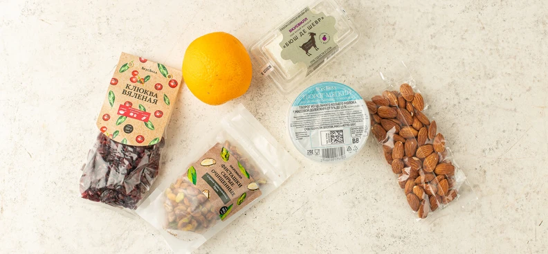 В рецепте используются товары из категорий: Молочные продукты, яйцо; Орехи, чипсы и снеки; Овощи, фрукты, ягоды, зелень