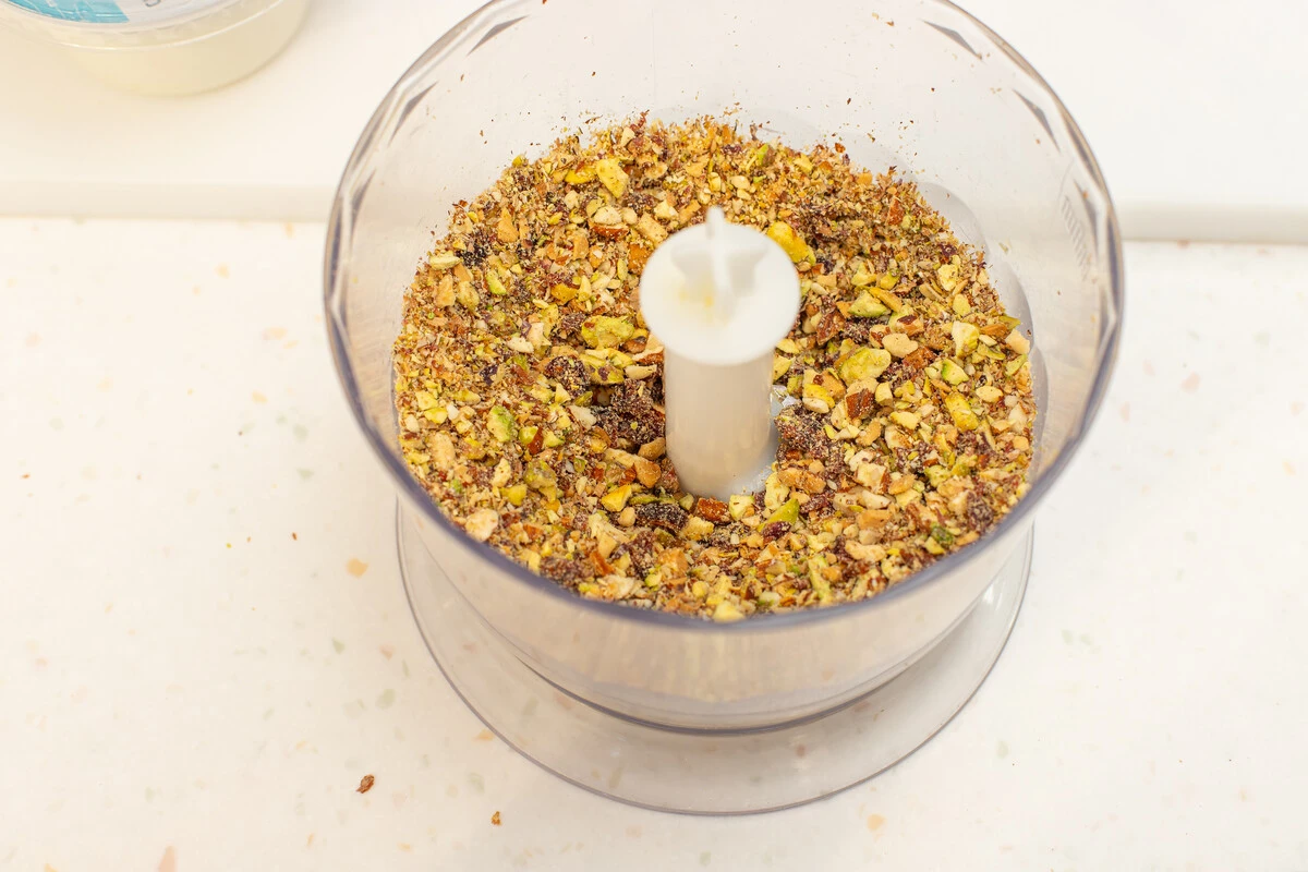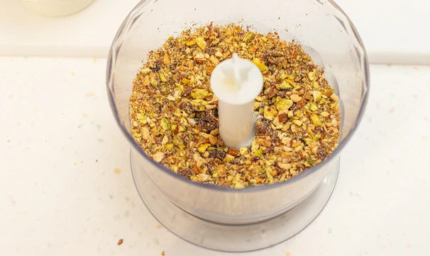 Насыпьте в чашу блендера орехи и клюкву и измельчите так, чтобы остались маленькие кусочки.