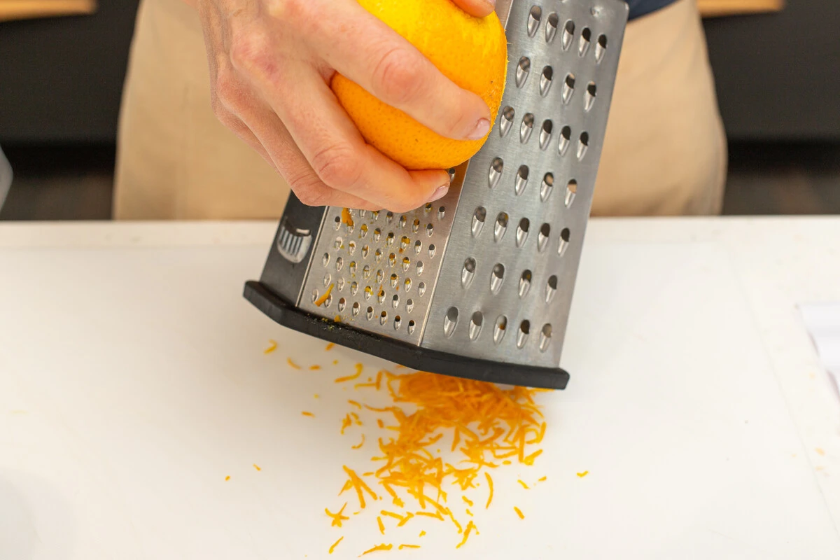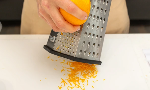 С апельсина аккуратно снимите треть цедры, не затрагивая белый слой. Добавьте её в молотые орехи с клюквой, перемешайте.