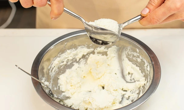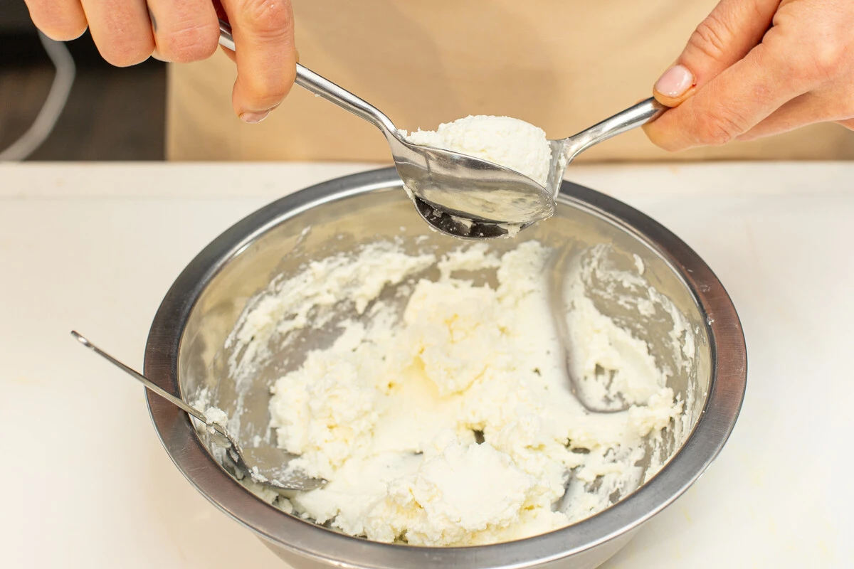 В миске смешайте козий сыр и творог. Сформируйте шарики диаметром примерно 4-5 см. Сделать это можно руками или с помощью двух ложек.