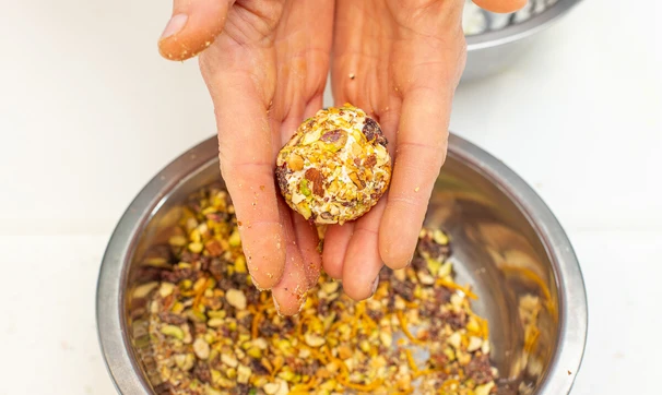 Обваляйте каждый шарик в смеси орехов и сухофруктов.