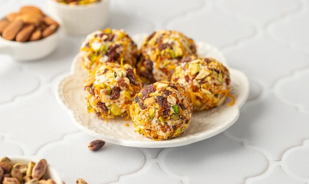 Шарики из козьего сыра в обсыпке из орехов и сухофруктов