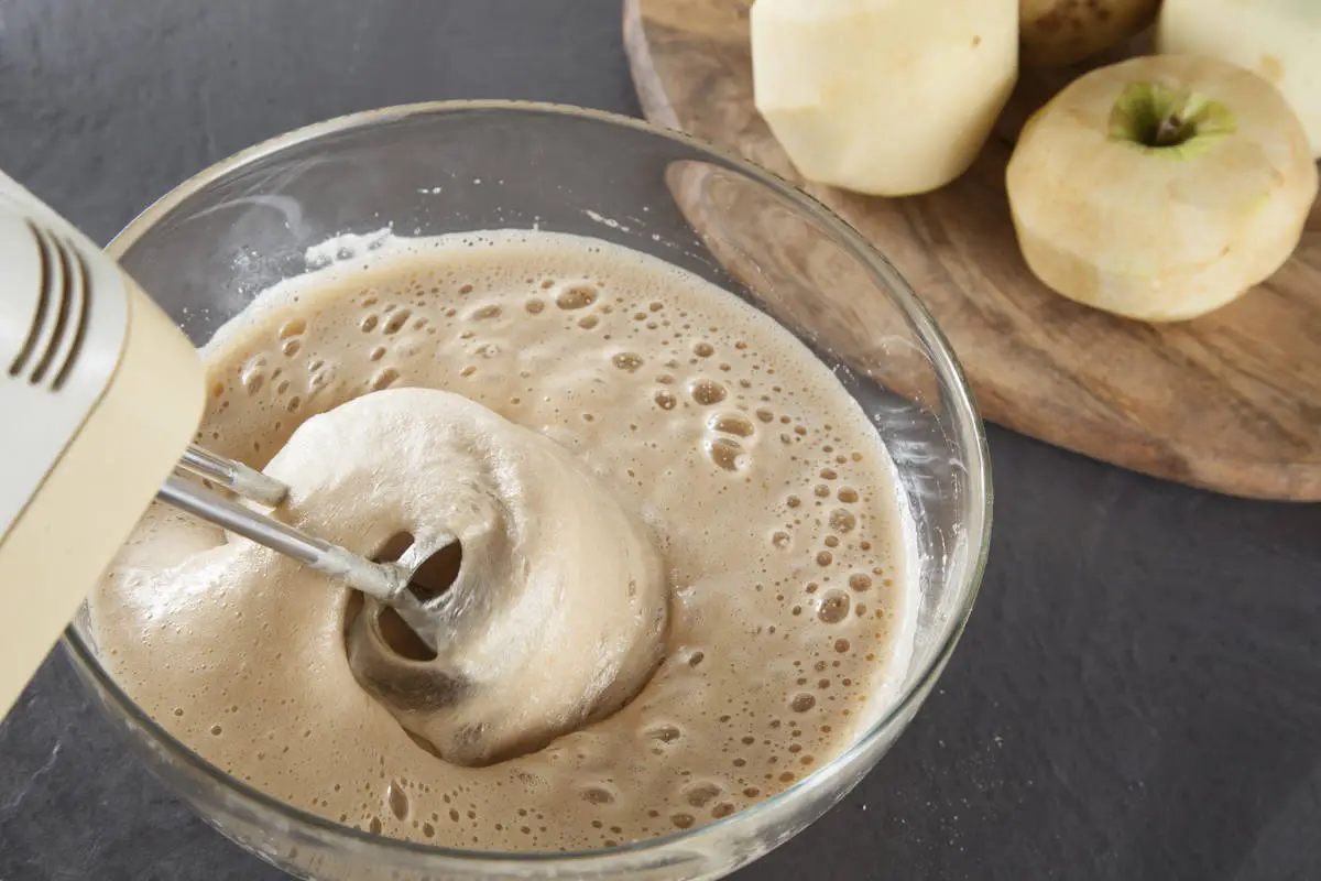 Два вида муки просейте в чашу с яйцами, аккуратно перемешайте. При желании, для большей пышности можно добавить в тесто щепотку соды и влить ложечку лимонного сока, перемешать.