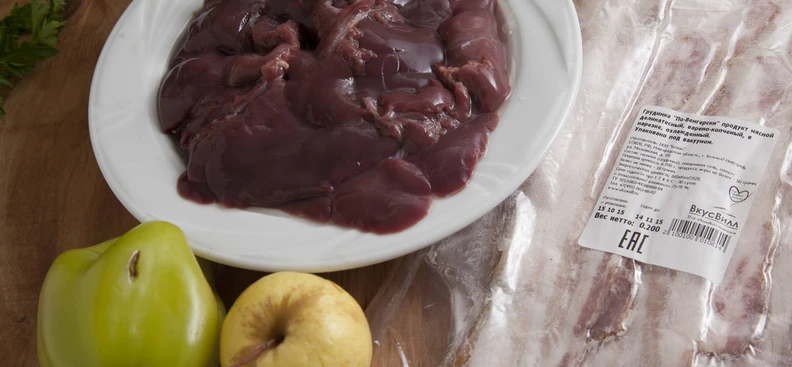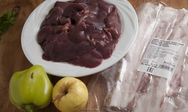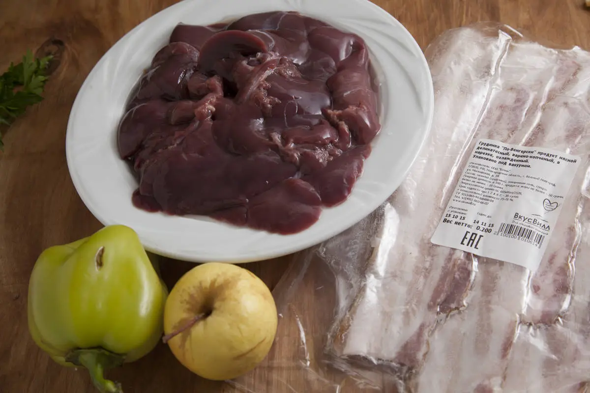 Насаживайте на шпажки печень, оборачивая ее беконом, кусочки печени перемежайте с яблоком и перцем.