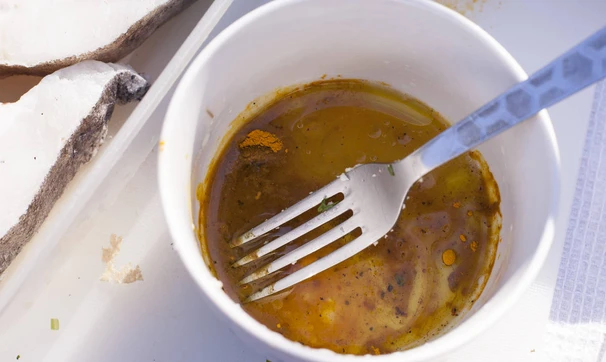 Для маринада снимите цедру с лимона, из половинки выжмите сок и смешайте с 1 ст. ложкой оливкового масла, солью, перцем и куркумой.
