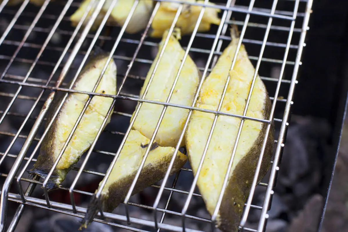 Решетку гриля смажьте маслом, выложите филе и жарьте на не слишком горячих углях до готовности. Подавайте с соусом и свежими овощами — приятного аппетита!