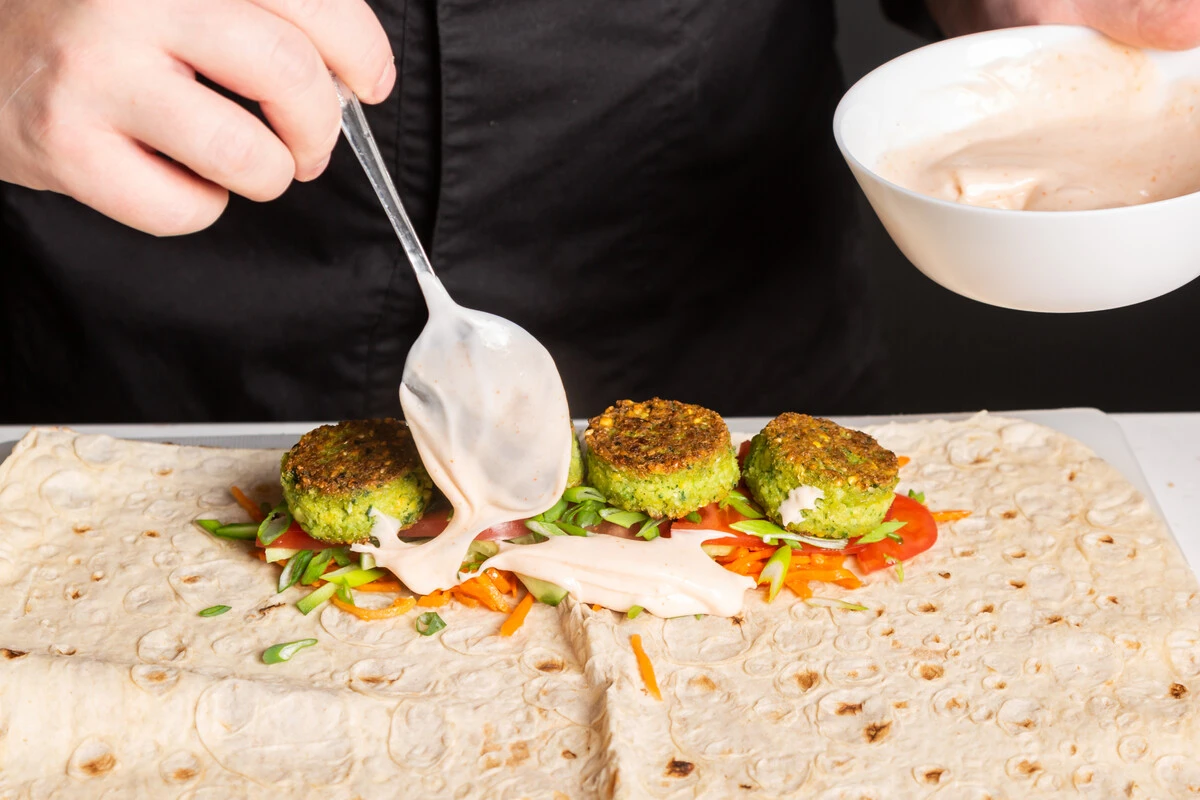 На лист лаваша выложите половину овощей, 4 шарика фалафеля, половину соуса и заверните в шаурму. Повторите с оставшимся лавашом.