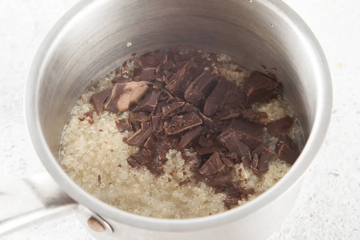 Шоколадная каша из полезной киноа – отличная идея! В горячем виде – это сытный завтрак, а в остывшем необычный десерт. Для этого рецепта хорошо использовать малину, ежевику, вишню или клубнику, также подойдут персики и инжир. Такую кашу хорошо варить на воде, так как шоколад сам по себе дает яркий вкус.