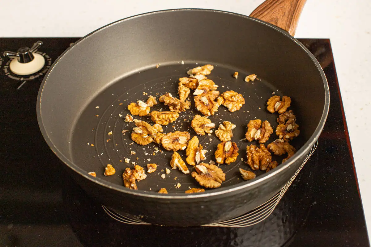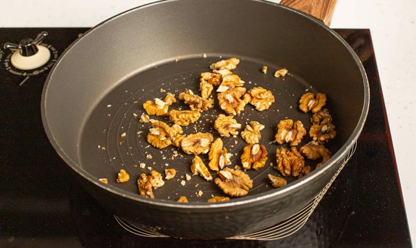 Грецкие орехи слегка обжарьте, а затем порубите ножом не слишком мелко.