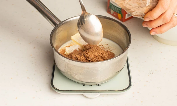 В кастрюльке или сотейнике соедините молоко со сливочным маслом, сахаром и какао.