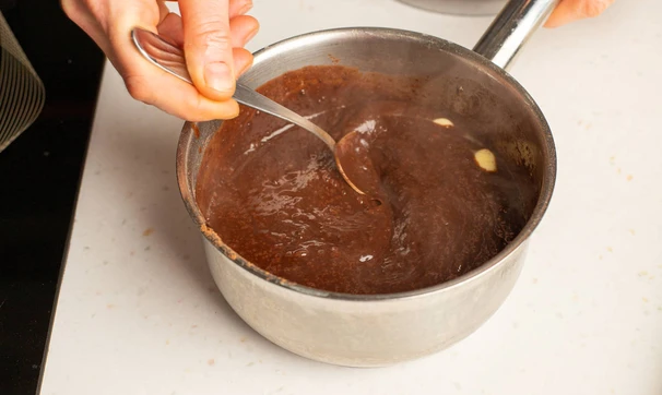 Нагрейте примерно до 80 °C, помешивая, пока все ингредиенты не соединятся в почти однородную массу.