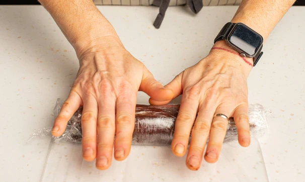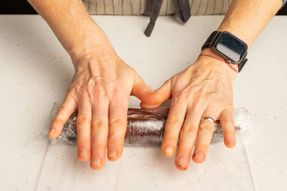 Выложите на пищевую плёнку и сформируйте колбасу.