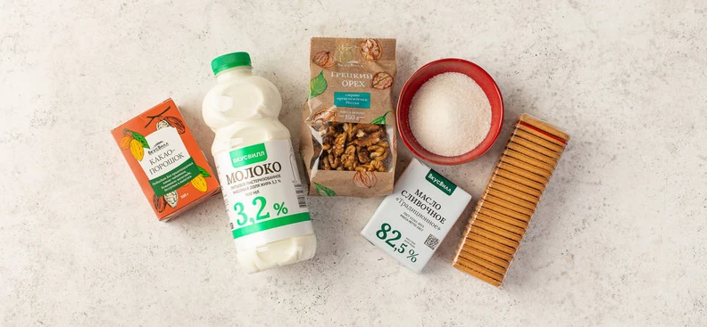 В рецепте используются товары из категорий: Сладости и десерты; Орехи, чипсы и снеки; Молочные продукты, яйцо; Масла, соусы, специи, сахар и соль; Чай и кофе