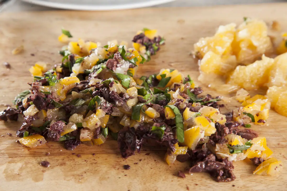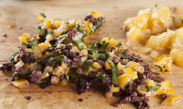Смешайте цедру, петрушку и маслины, посолите при необходимости, добавьте специи.