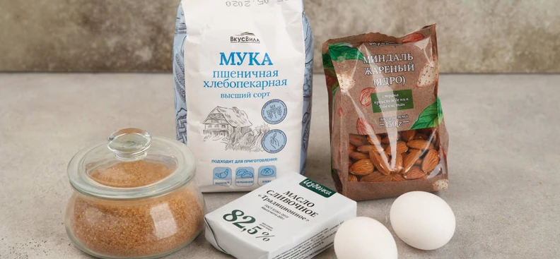 В рецепте используются товары из категорий: Молочные продукты, яйцо; Крупы, макароны, мука; Орехи, чипсы и снеки