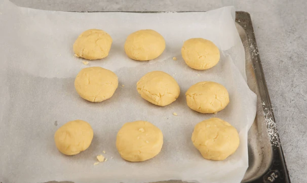 Сформируйте шарики из теста, вкладывая в центр по ореху. Выложите шарики на застеленный пергаментом противень и поставьте в разогретую до 200 °C духовку на 15 минут.