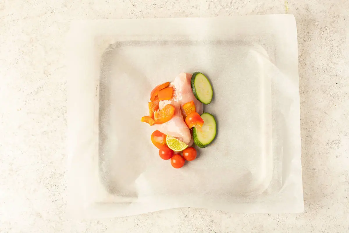На квадрат пергамента положите филе, добавьте несколько кружочков цукини, немного перца и 3-4 целых черри. Посолите, поперчите, посыпьте специями и полейте соевым соусом и соком лайма.