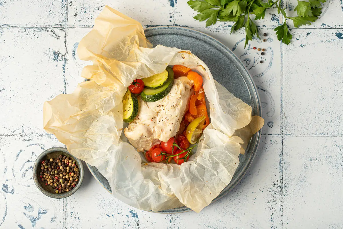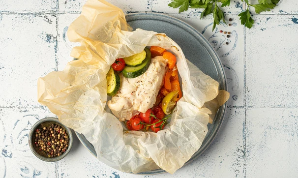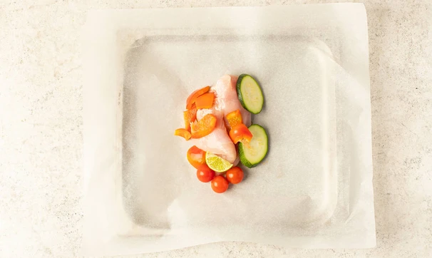 Если завернуть куриное филе в пергамент, добавить к нему сочных овощей и быстро запечь, то получается полноценный обед в индивидуальном конвертике.