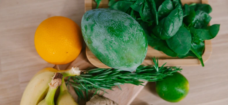 Добавьте шпинат. Из лайма и апельсина выдавите сок и добавьте к фруктам. Если пюре окажется слишком густым, можно добавить немного воды.