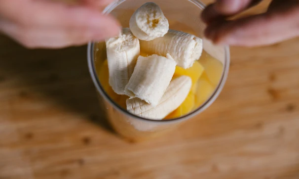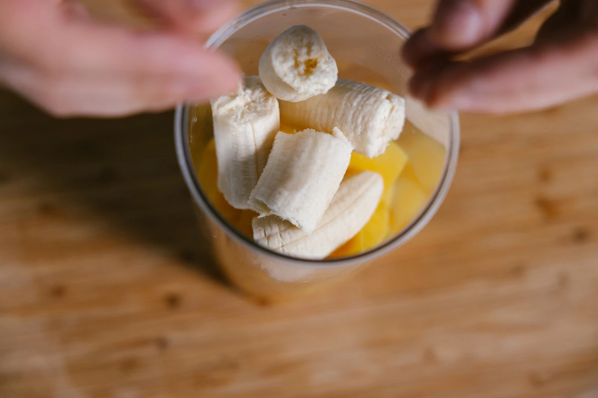Мякоть манго, банана, имбиря отправьте в блендер.
