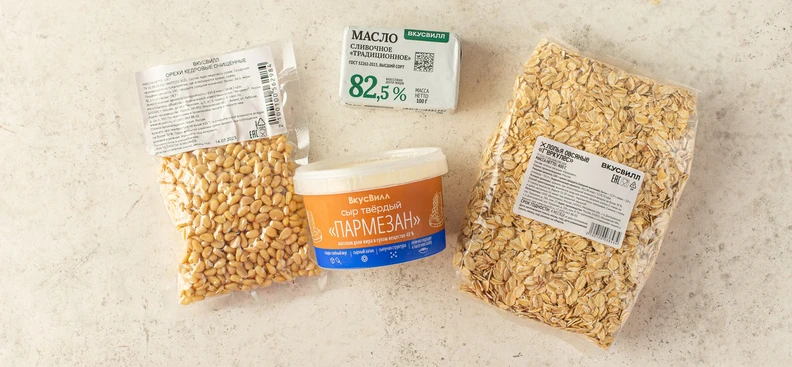 В рецепте используются товары из категорий: Крупы, макароны, мука; Молочные продукты, яйцо; Орехи, чипсы и снеки
