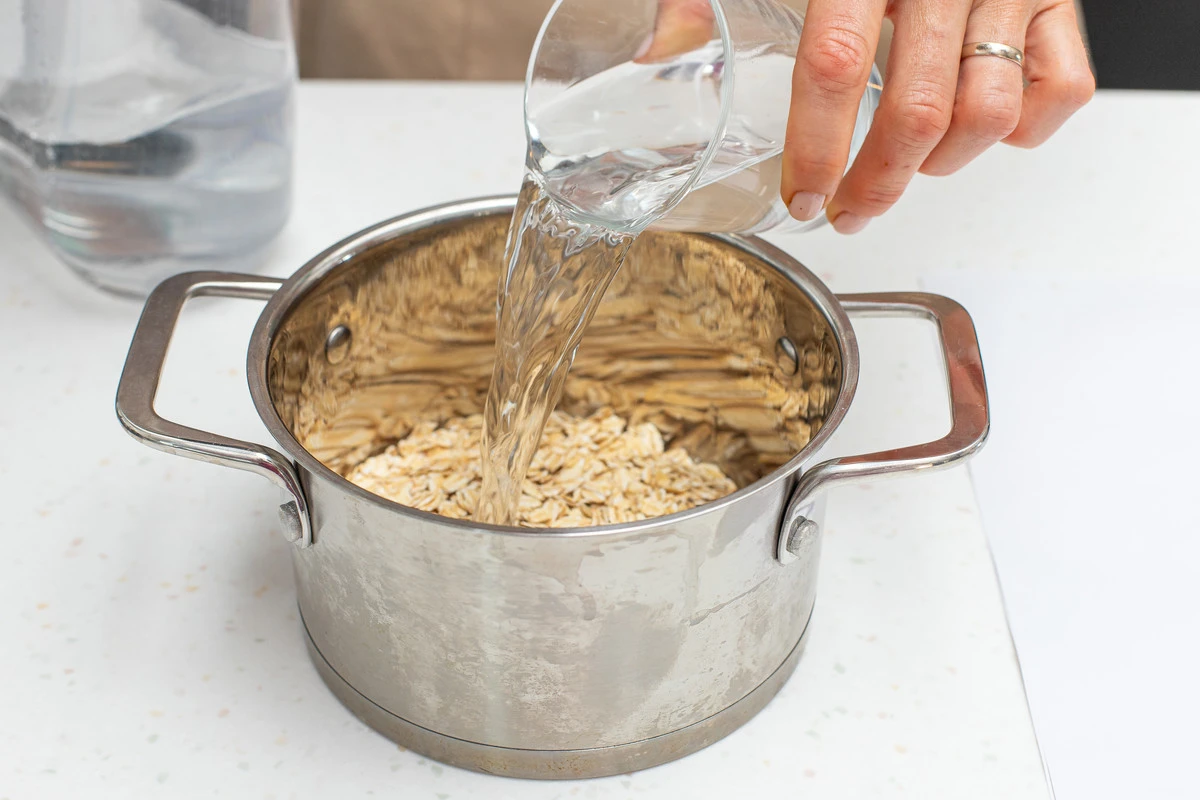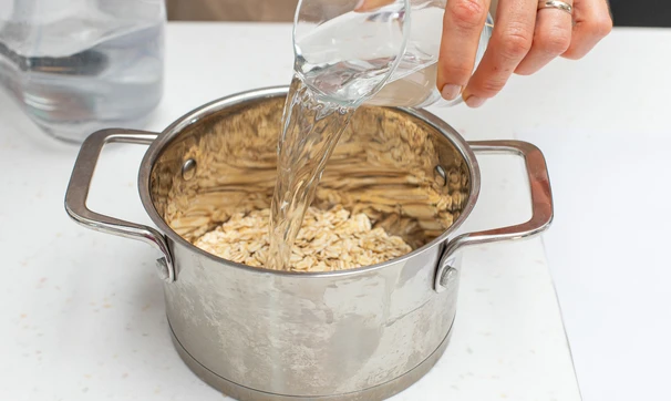 Высыпьте овсяные хлопья в кастрюлю, залейте водой. Доведите до кипения и варите до полной готовности, периодически помешивая. Вода должна полностью впитаться.