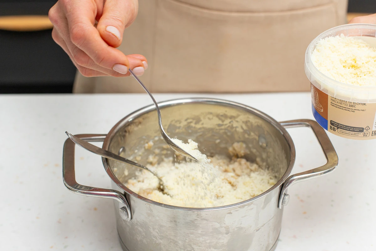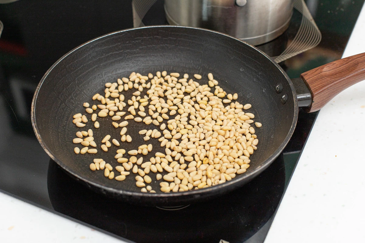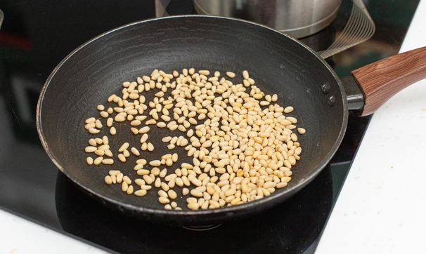 Добавьте часть подрумяненных кедровых орехов и хорошо перемешайте.