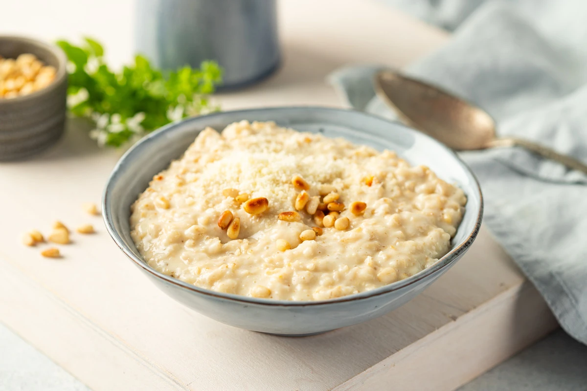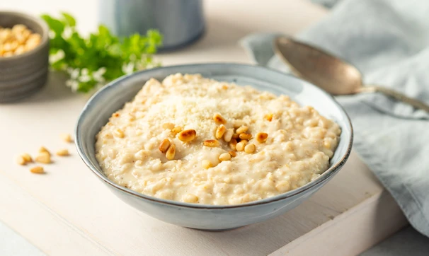 Солёная овсянка с пармезаном и кедровыми орехами
