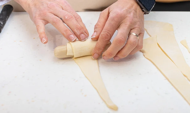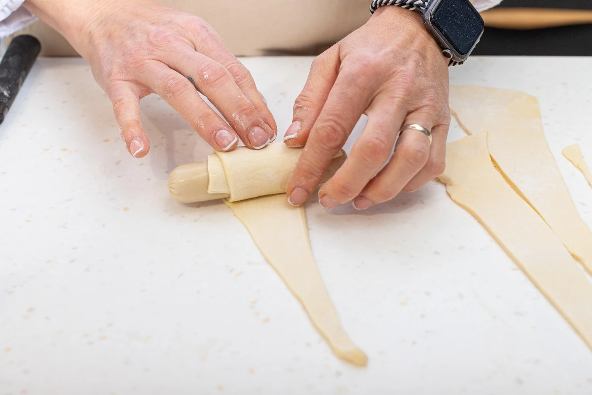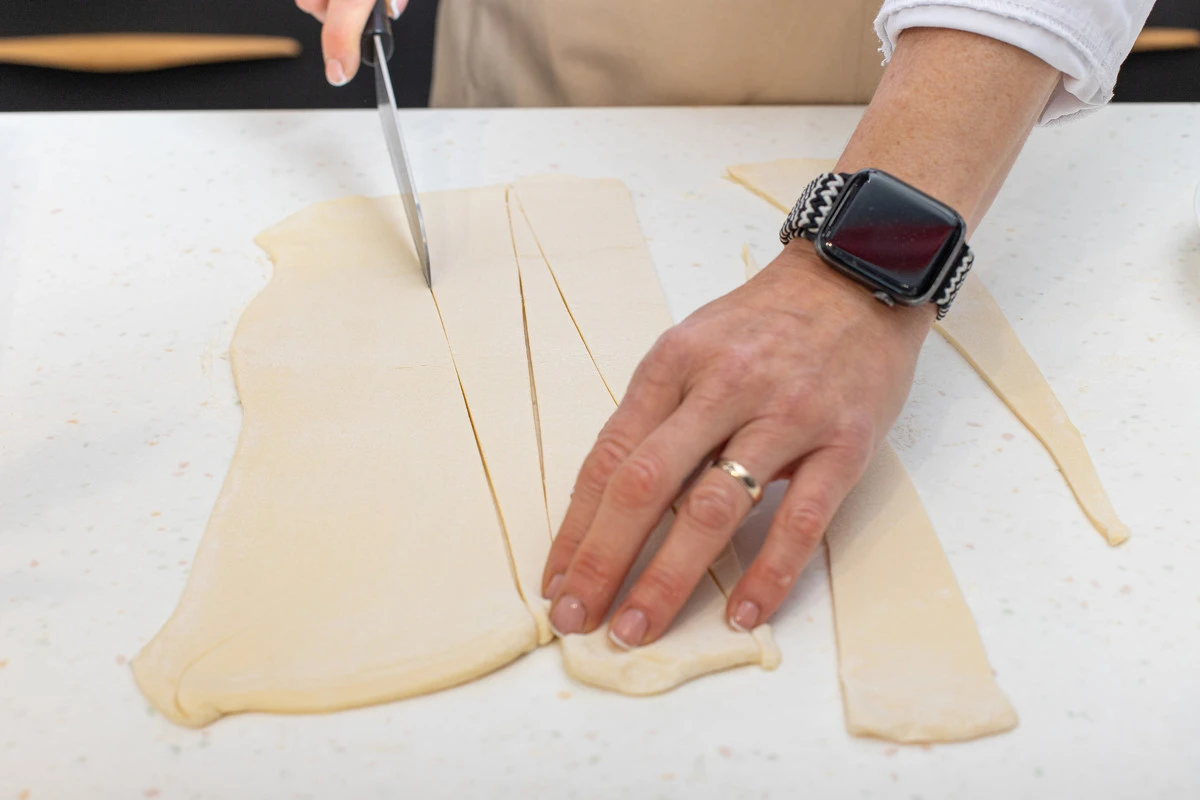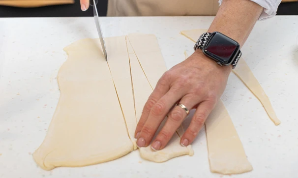 Острым ножом сделайте прямые поперечные разрезы так, чтобы получились сильно вытянутые треугольники. Всего для рецепта понадобится 12 треугольников.