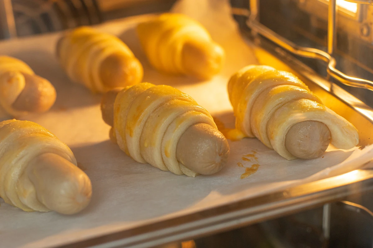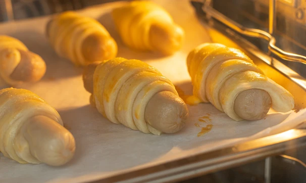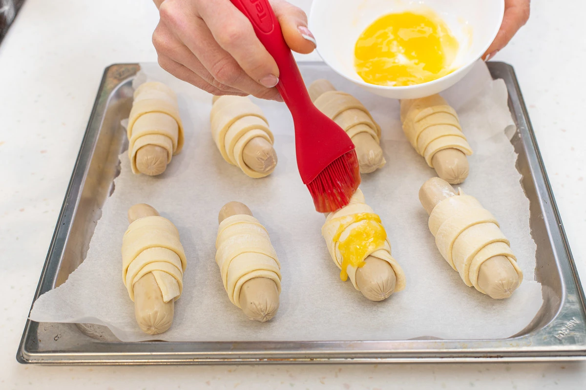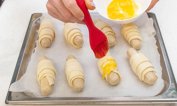На широкую сторону треугольника поместите сосиску и заверните её в тесто. Повторите с остальными сосисками и тестом. Выложите на противень, застеленный пергаментом.