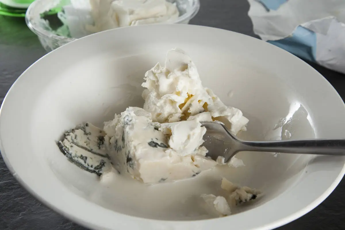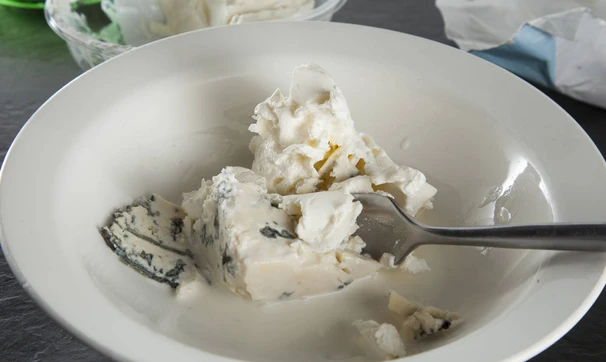 Разомните вилкой голубой сыр вместе с КремЧизом, добавив немного сливок. Готово!