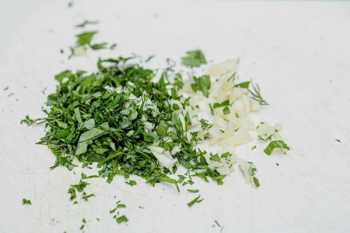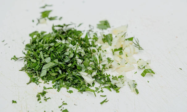 Из дольки чеснока обязательно удалите сердцевинку, сам чеснок измельчите, порубите мелко зелень.