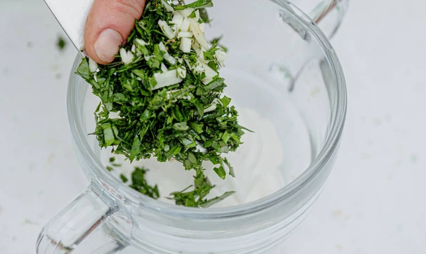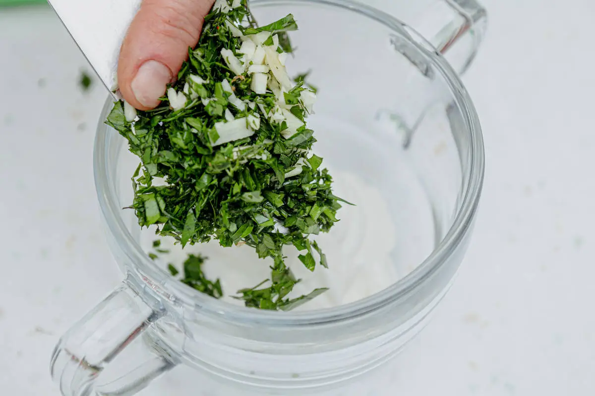 Добавьте чеснок и зелень к сметане, посолите, перемешайте.