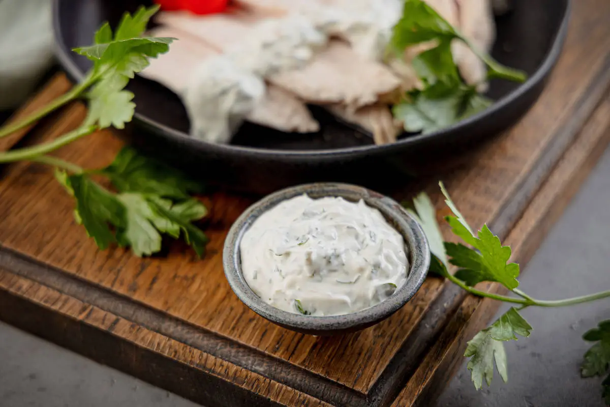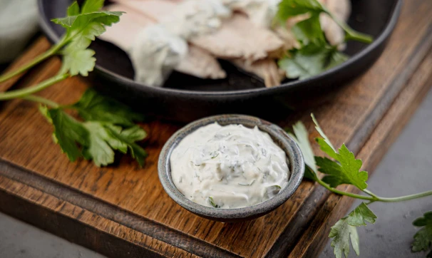 Самый простой и очень эффектный соус из сметаны. Подойдёт к любому мясу и птице, особенно отварным, хорош к овощным оладушкам или драникам, жареным кабачкам, картошке фри и т.д.