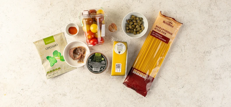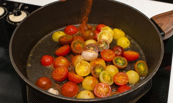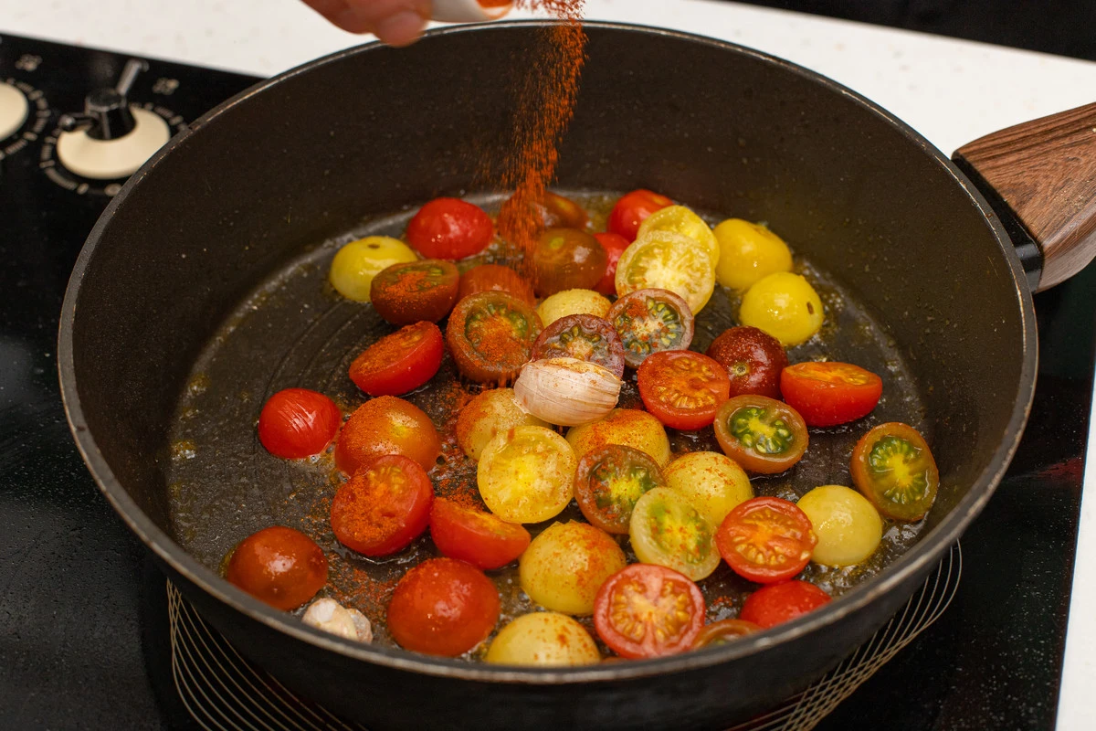 Обжарьте черри на столовой ложке оливкового масла с чесноком, солью, паприкой и орегано в течение пары минут на среднем огне. Добавьте оливки, каперсы и мелко нарезанных анчоусов. Перемешайте соус.