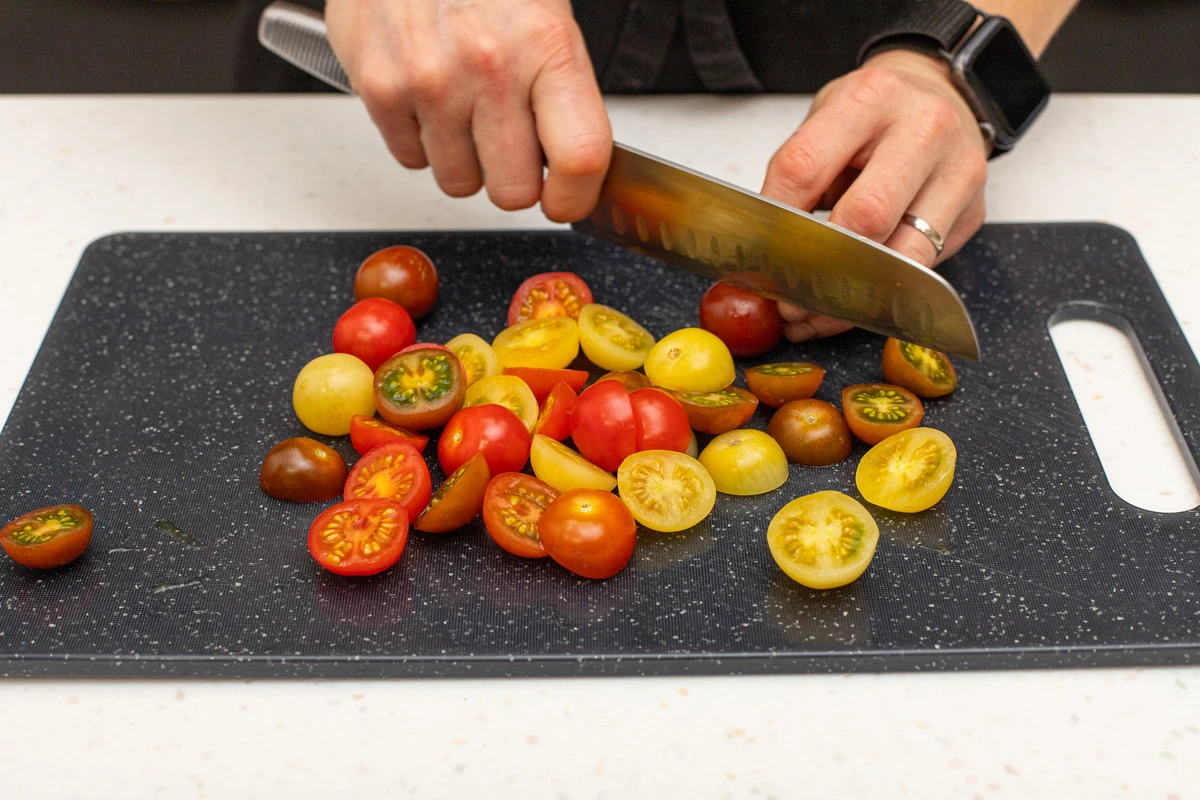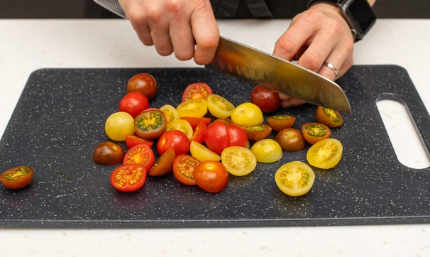 Помидорки черри разрежьте пополам. Лучше брать томаты разных цветов, так паста получится красивее, но это не обязательно.