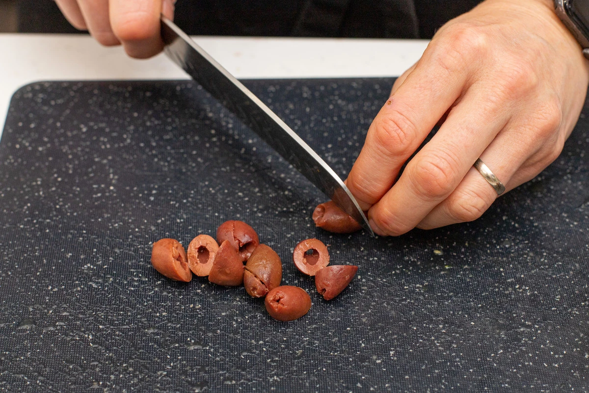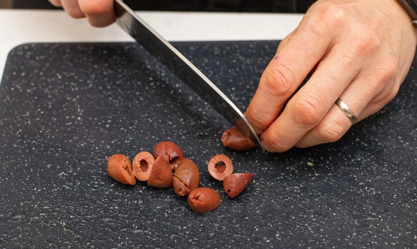Оливки также разрежьте пополам. Два зубчика чеснока очистите от верхнего слоя шелухи и раздавите плоской стороной ножа.