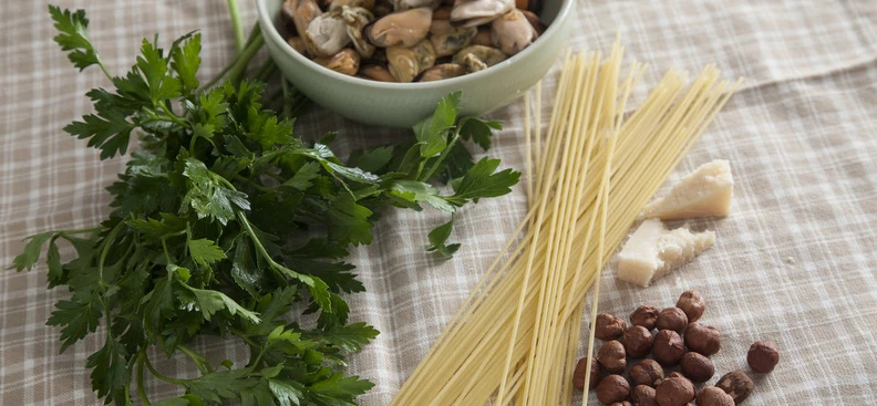 Спагетти с мидиями и песто из петрушки