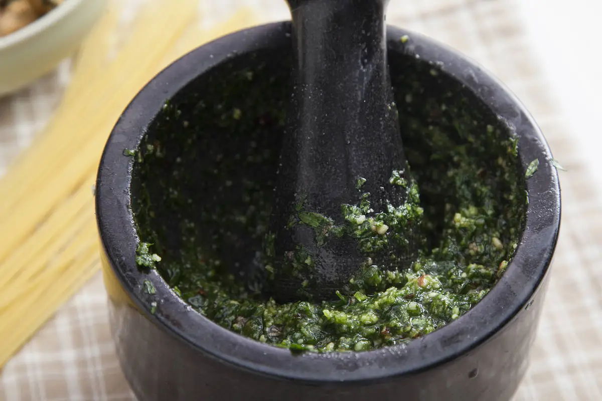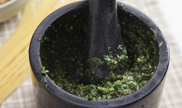 В ступке растолките чеснок с несколькими крупинками соли, затем добавляйте понемногу листики, растирая их в однородную массу, следом тертый сыр и дробленые орехи, затем, когда соус станет блестящим, вливайте понемногу масло.