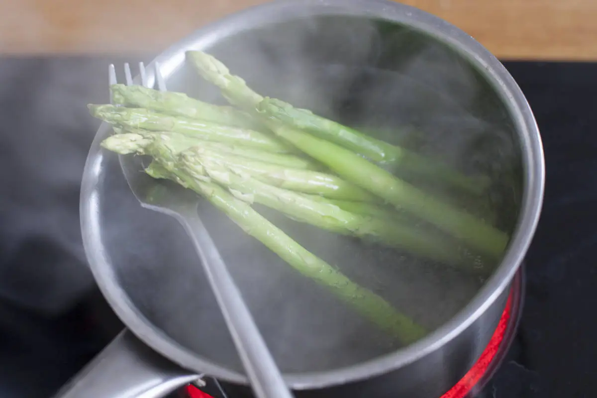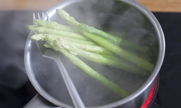 В маленькой кастрюле вскипятите воду, подсолите, положите спаржу так, чтобы нежные головки были над поверхностью воды и варились на пару, готовьте около 2-х минут.
