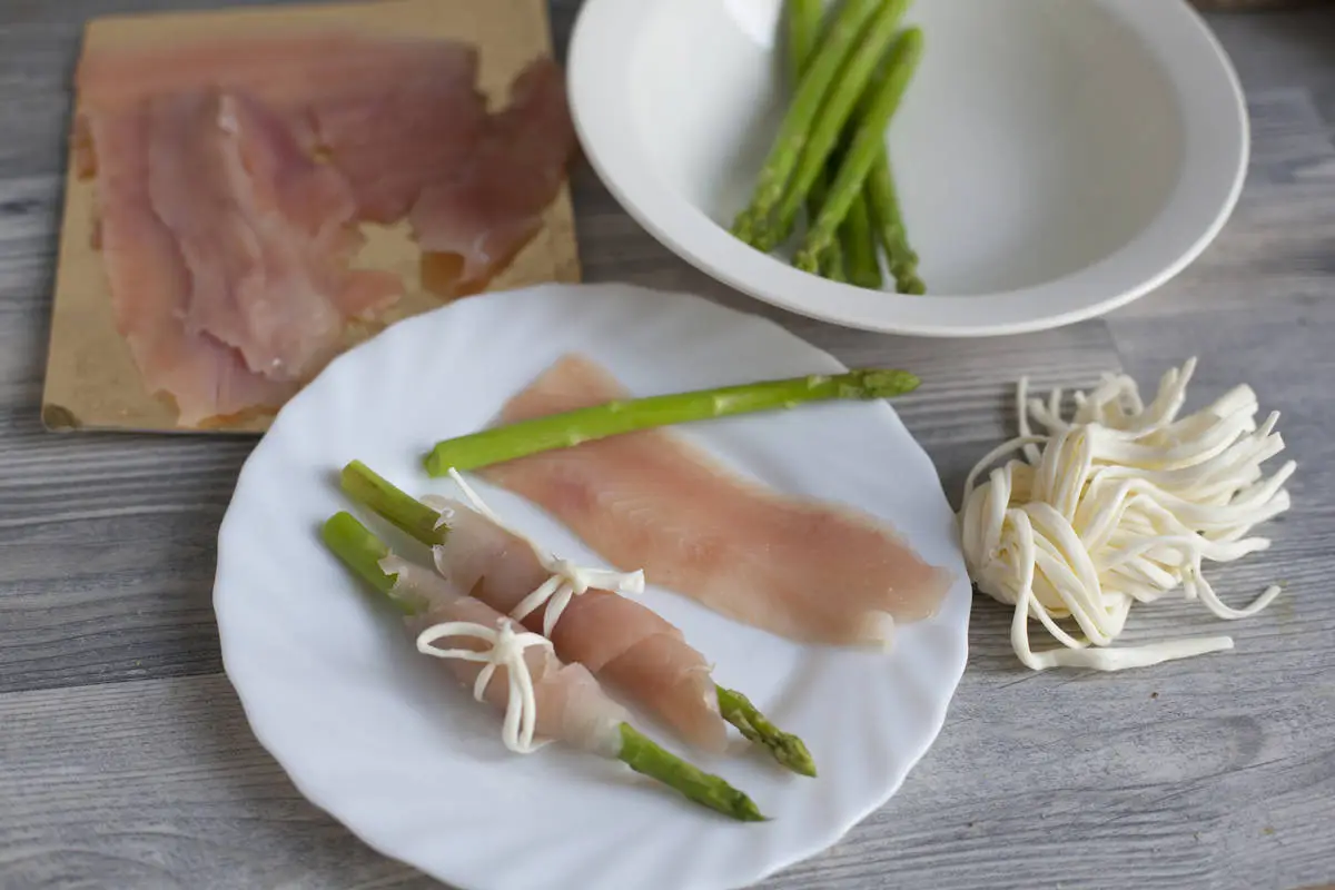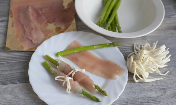 Готовую спаржу сразу выньте и переложите в ледяную воду на минуту. Каждый побег спаржи оберните ломтиком форели и обвяжите сырной нитью. Подавайте к праздничному столу!