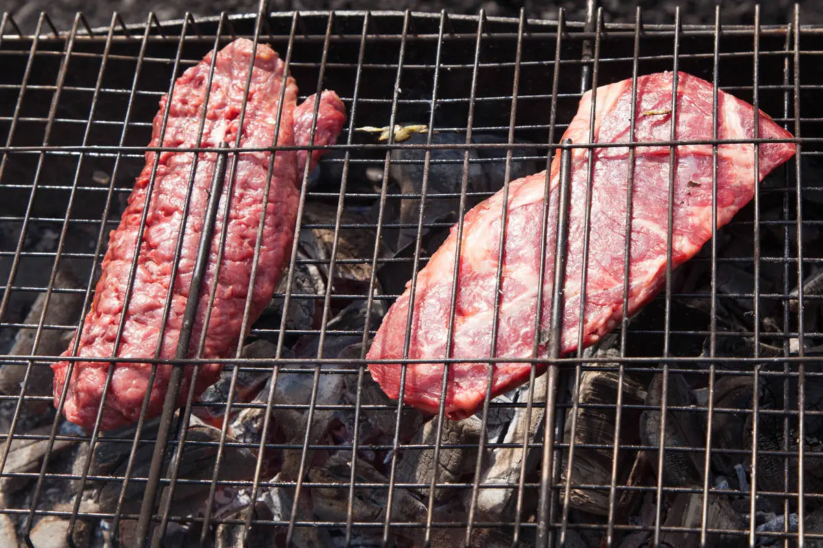 Угли должны быть горячими (красными), выложите смазанные оливковым маслом стейки на решетку и жарьте над углями примерно по полторы-две минуты с каждой стороны. Время может меняться в зависимости от качества угля и желаемой степени прожарки, надежнее всего пользоваться термометром для мяса. Температура внутри куска для прожарки «с кровью» -50-55°C, средняя прожарка — 60—65°C.