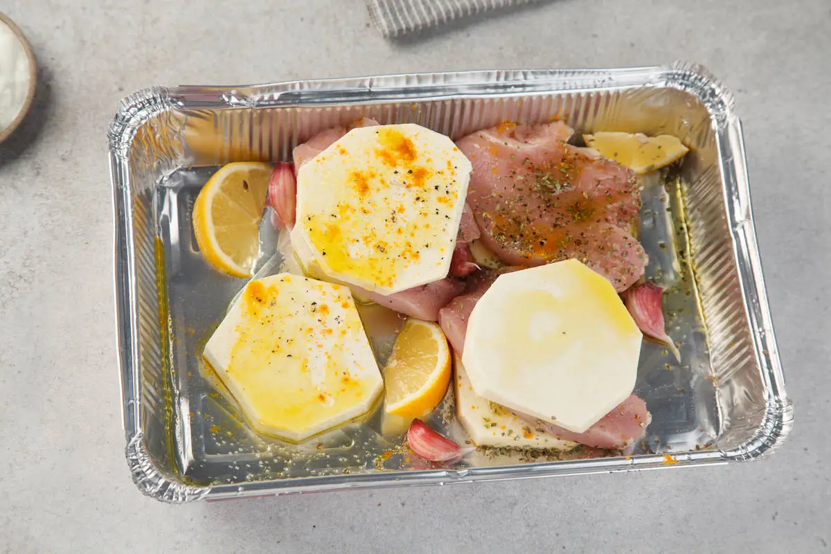 В форму для запекания выложите слоями ямс, затем индейку, сверху снова ямс. Получившиеся «башенки» посолите, поперчите, посыпьте специями, полейте соком лимона и маслом. Неочищенные зубчики чеснока и дольки лимона разложите между «башенок».