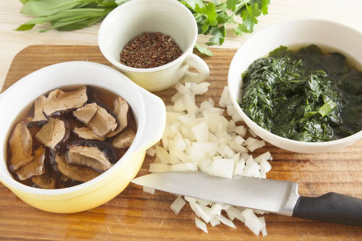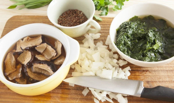 Белые грибы залейте небольшим количеством кипятка, отставьте. Лук и шпинат порежьте и спассеруйте на сливочном масле.
