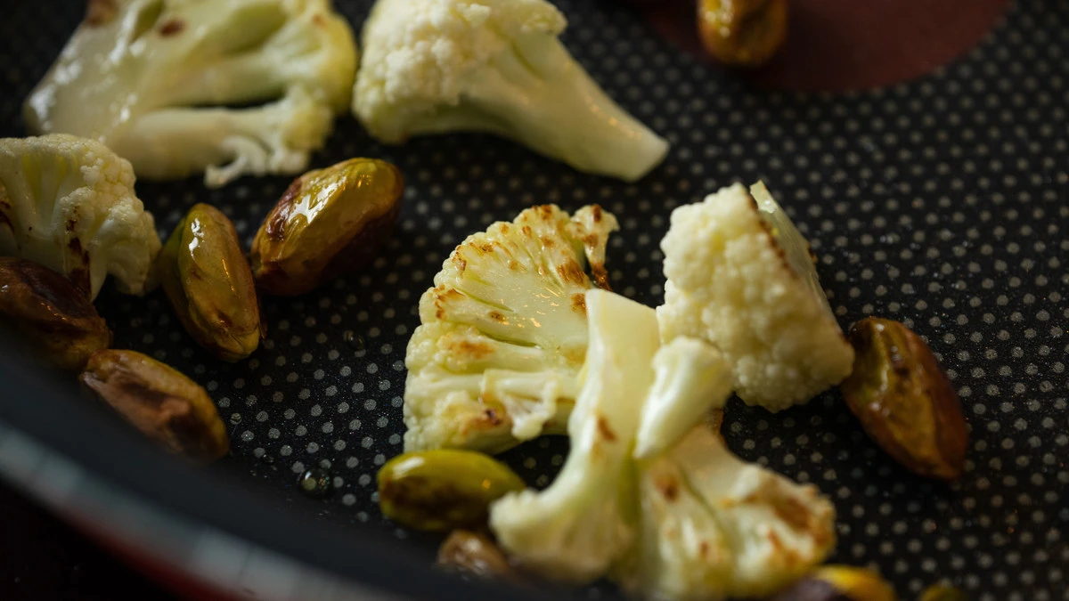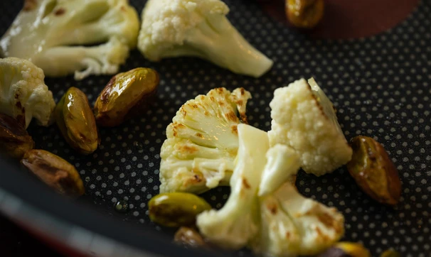Очищенные фисташки и несколько соцветий цветной капусты обжарьте несколько минут, отложите для подачи.