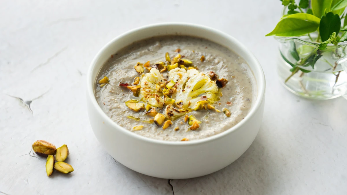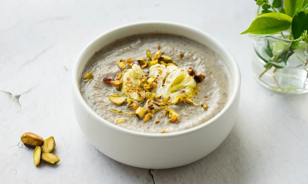 Подавайте грибной суп-пюре, добавив в тарелки обжаренные фисташки и цветную капусту.