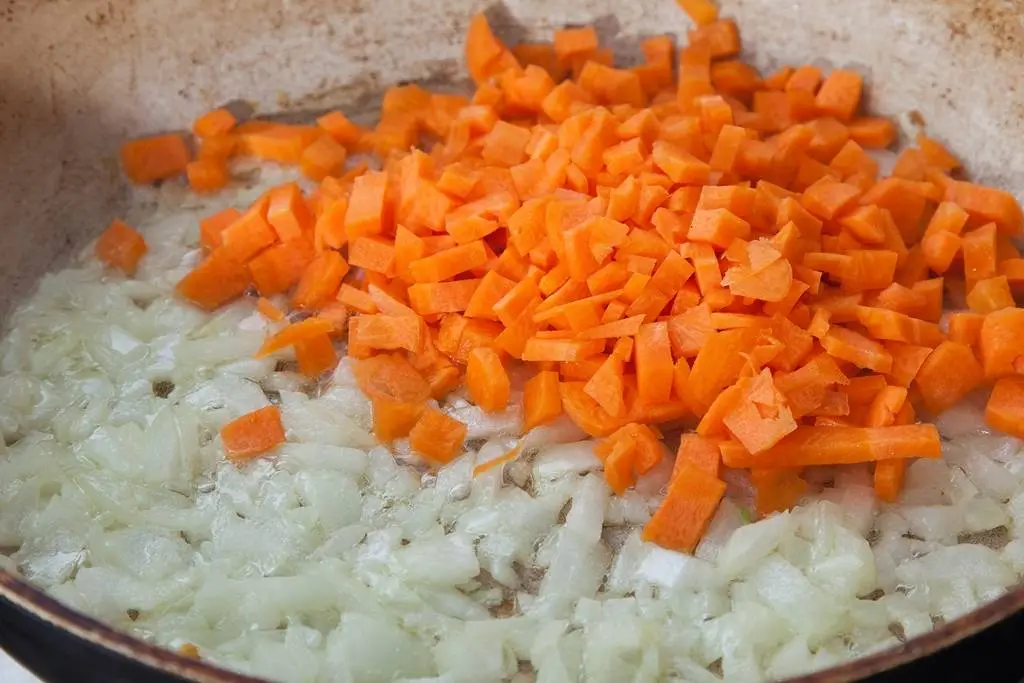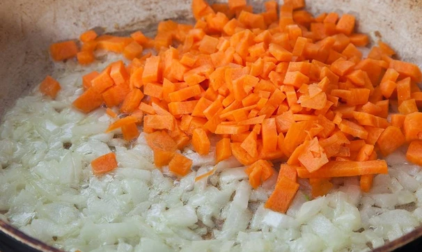 Лук нарежьте мелко и поджарьте на растительном масле, затем добавьте порезанную соломкой морковь и жарьте еще 5 минут.