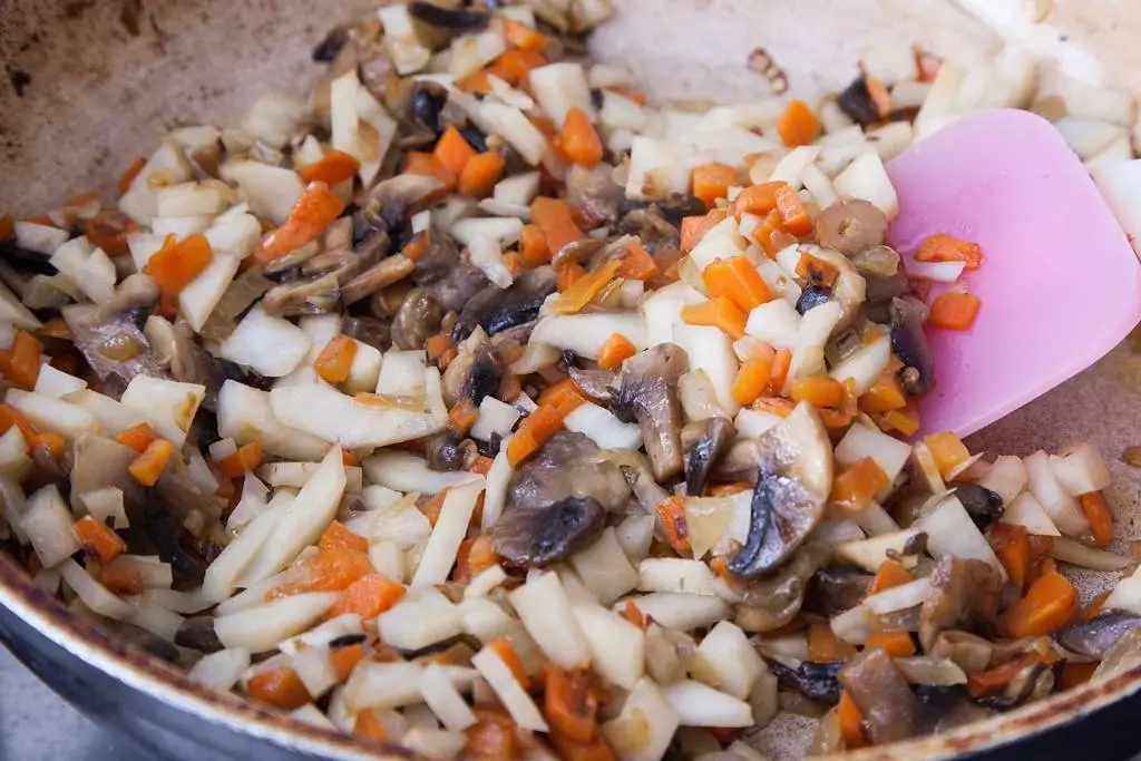 Овощную смесь добавьте в суп и варите до готовности гречки.